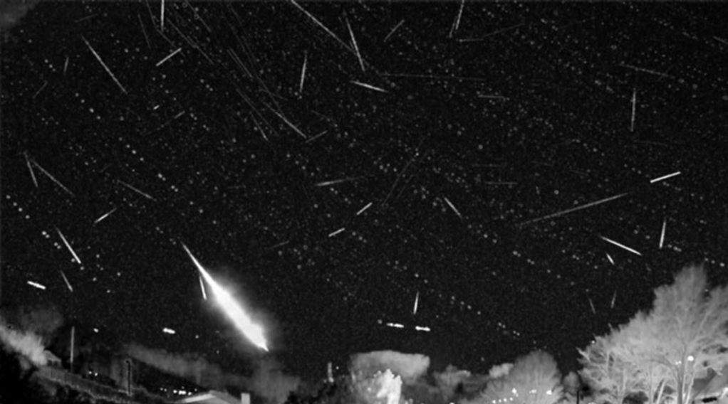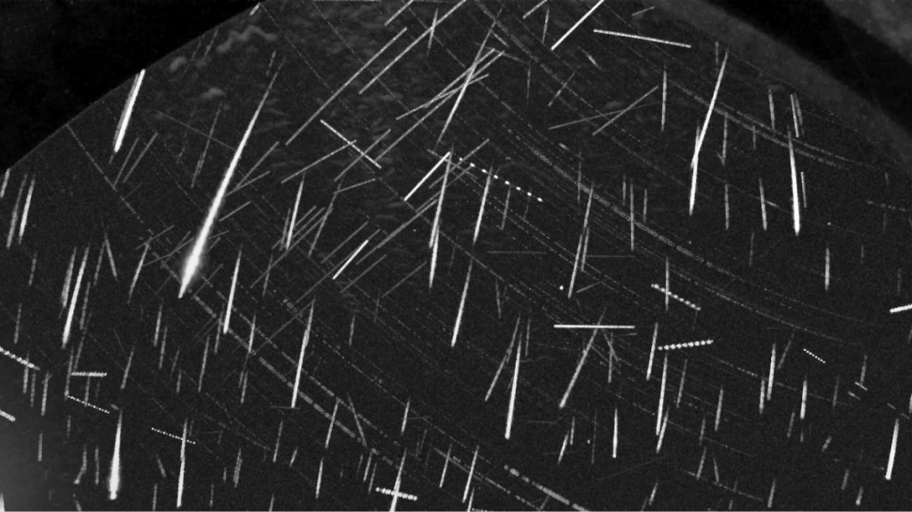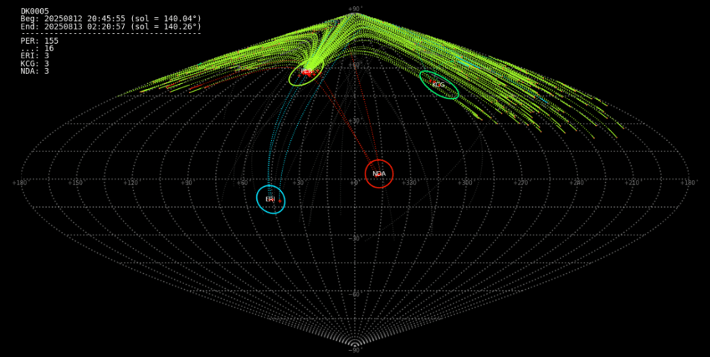 The image below is a radiant map, which shows the position in the night sky of the source of the meteors captured by one camera. Here, this one imaged 155 Perseid meteors on the night of the 13th of August. Information on this type of radiant map can be found here.